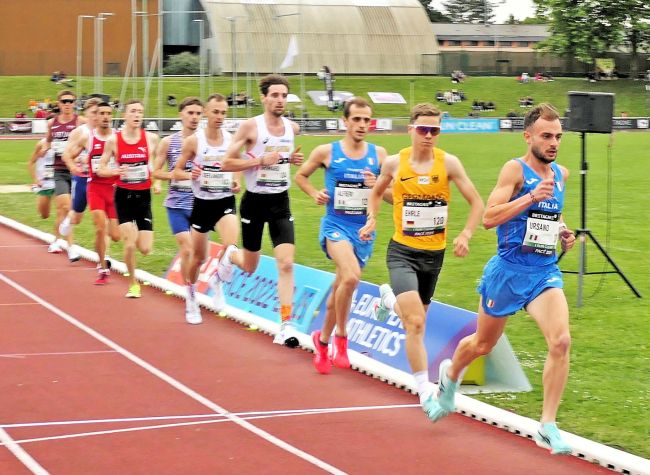 Lukas Ehrle (2. von rechts, im Trikot des DLV) lief beim Europacup im französischen Pacé über die 10.000-Meter-Distanz als Fünfter ins Ziel. Seine Zeit von 28.40,22 Minuten bedeutete persönliche Bestleistung und neuer badischer Rekord.