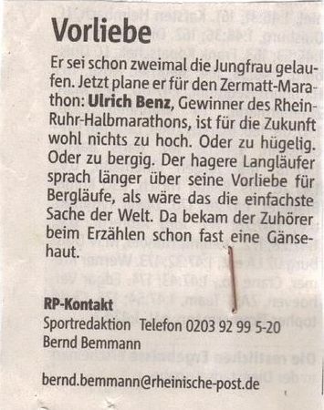 Als Vorbereitung für den legendären Matterhorn-Marathon am 4. Juli stand ein schneller flacher Halbmarathon auf dem Trainingsprogramm von Ulrich Benz. Dass dieser mit einem Sieg der über 3000 Teilnehmer endete, ist umso erfreulicher. "Es war schon ein tolles Gefühl als Sieger ins MSV Stadion einzulaufen" so Ulrich Benz. Er benötigte für die 21 km 1:11:13 Std.
