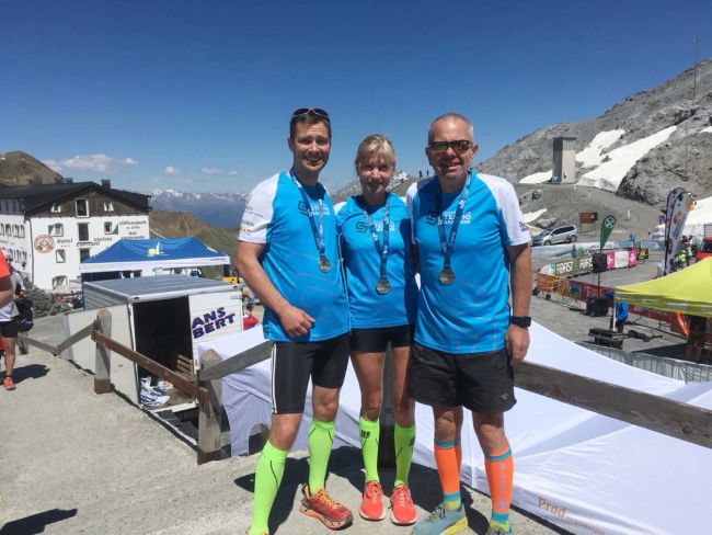 Daniel Knäble, Rosi Knäble, Bernd Ehrhardt (von links nach rechts) nach dem Zieleinlauf auf dem Stilfserjoch in einer Höhe von 2.700 m.