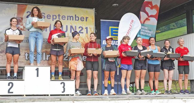 Der TrailRUN21 mit 19,6 Kilometern Länge und mit 695 Höhenmetern verlangte den Läuferinnen und Läufern alles ab. Die jeweils schnellsten Frauen und Männer durften für ihre Leistungen Pokale, Urkunden und gut gefüllte Geschenkkartons entgegen nehmen.
