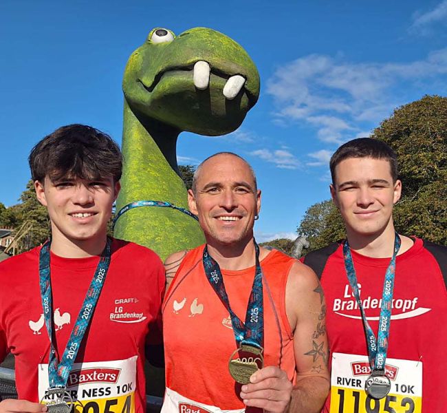 Doch Christian war nicht allein in Schottland am Start: Seine beiden Söhne absolvierten erfolgreich den 10-Kilometer-Lauf. Max Berghof erreichte nach 00:50:45 Stunden das Ziel, dicht gefolgt von Leo Berghof in 00:51:21 Stunden. Damit bewiesen auch die Nachwuchsläufer, dass Ausdauer und Kampfgeist in der Familie Berghof fest verankert sind.